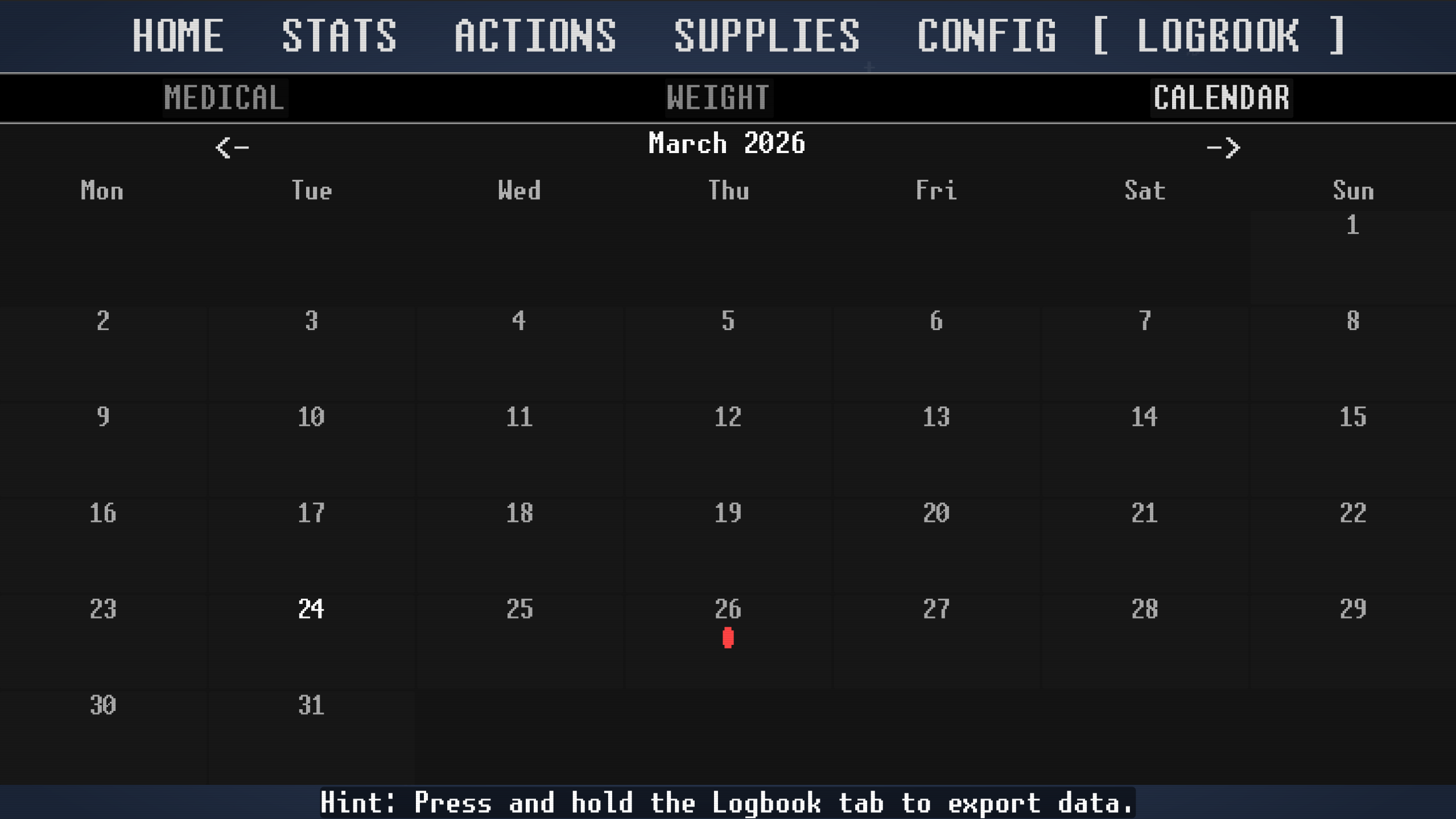 - Hidden Feature: If you ever need to share your records with a vet, or see them display on a single screen, press and hold the Logbook tab button for exactly one full second to reveal the Export System and "Vet View".